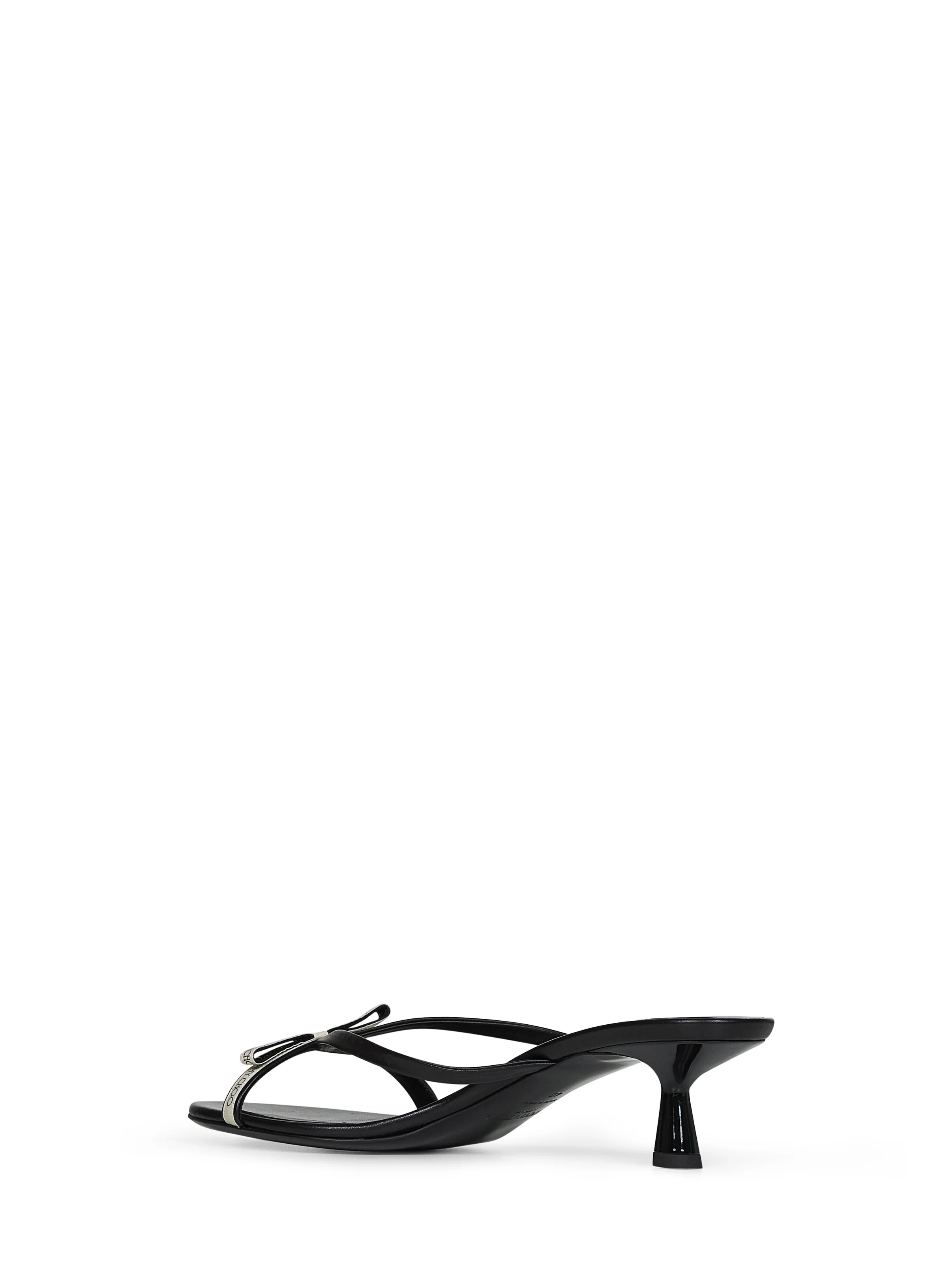 •Slip-on •Rounded toe •Thin leather straps; thin strap with Jimmy Choo ribbon and bow detail at front •Lacquered heel •Leather lining and insole •Leather sole •Heel height: 45mm •Black color •100% Calf Leather •Made in Italy