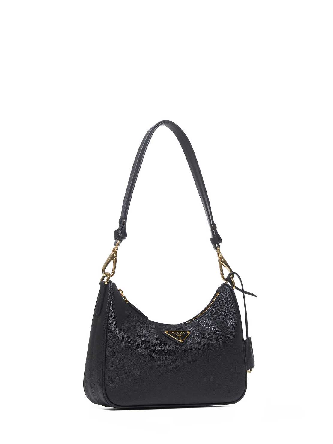 •Top zip closure •Adjustable and detachable leather top handle •Enamelled metal triangle logo at front; detachable leather key case •Interior: one main compartment; logoed nylon lining •Gold-toned metal hardware •Saffiano leather design •Black color •100% Leather •Made in Italy