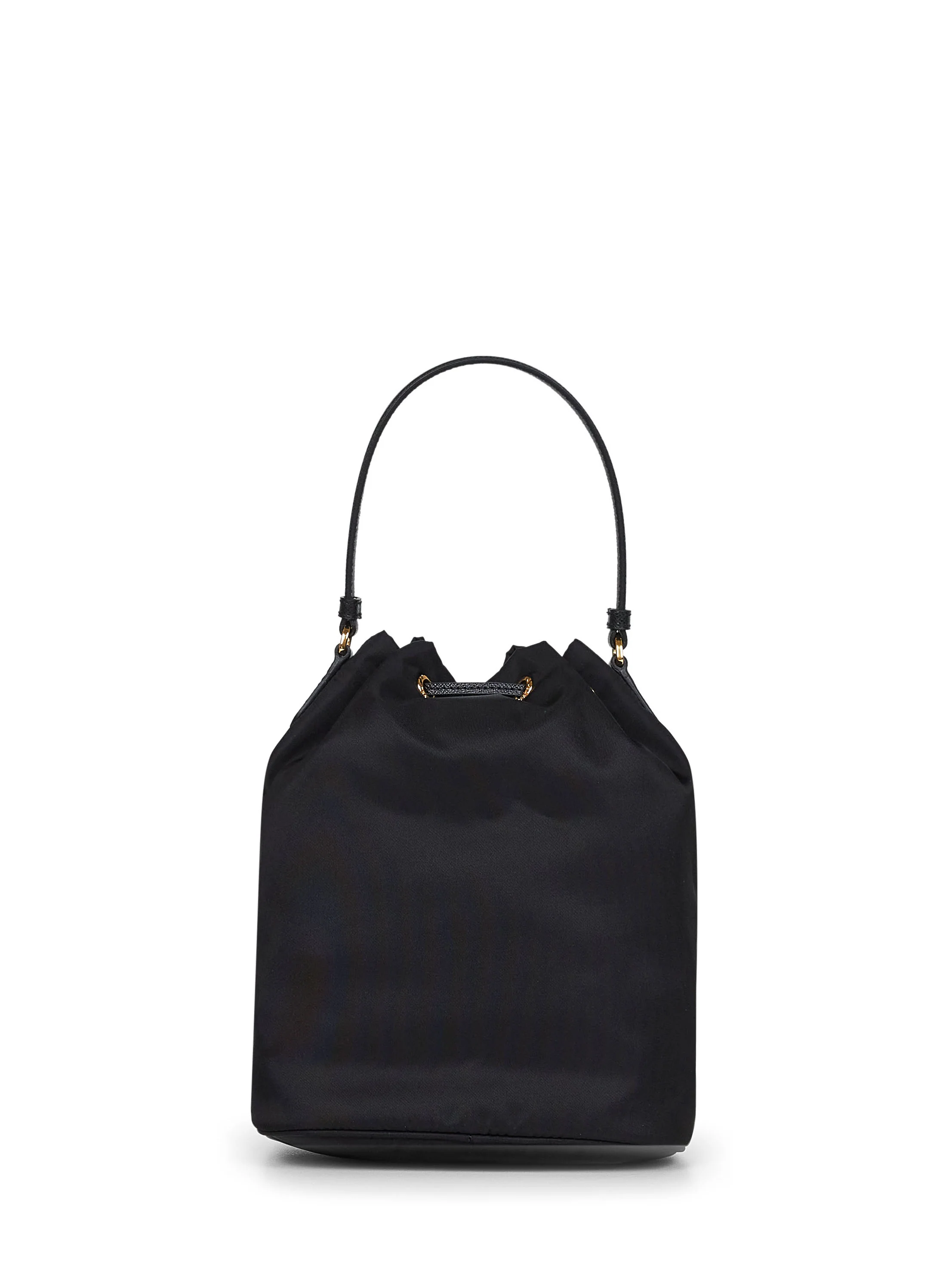 •Top adjustable leather drawstring fastening •Leather handle; adjustable and detachable leather shoulder strap •Interior: one main compartment, logoed Re-Nylon lining; exterior: front zipped patch pocket with enameled metal triangle logo at front •Gold-toned metal hardware •Saffiano leather details •Re-Nylon design •17.5 X 22.5 X 12 cm; shoulder strap: 100 cm •Black color •100% Polyamide •Made in Italy