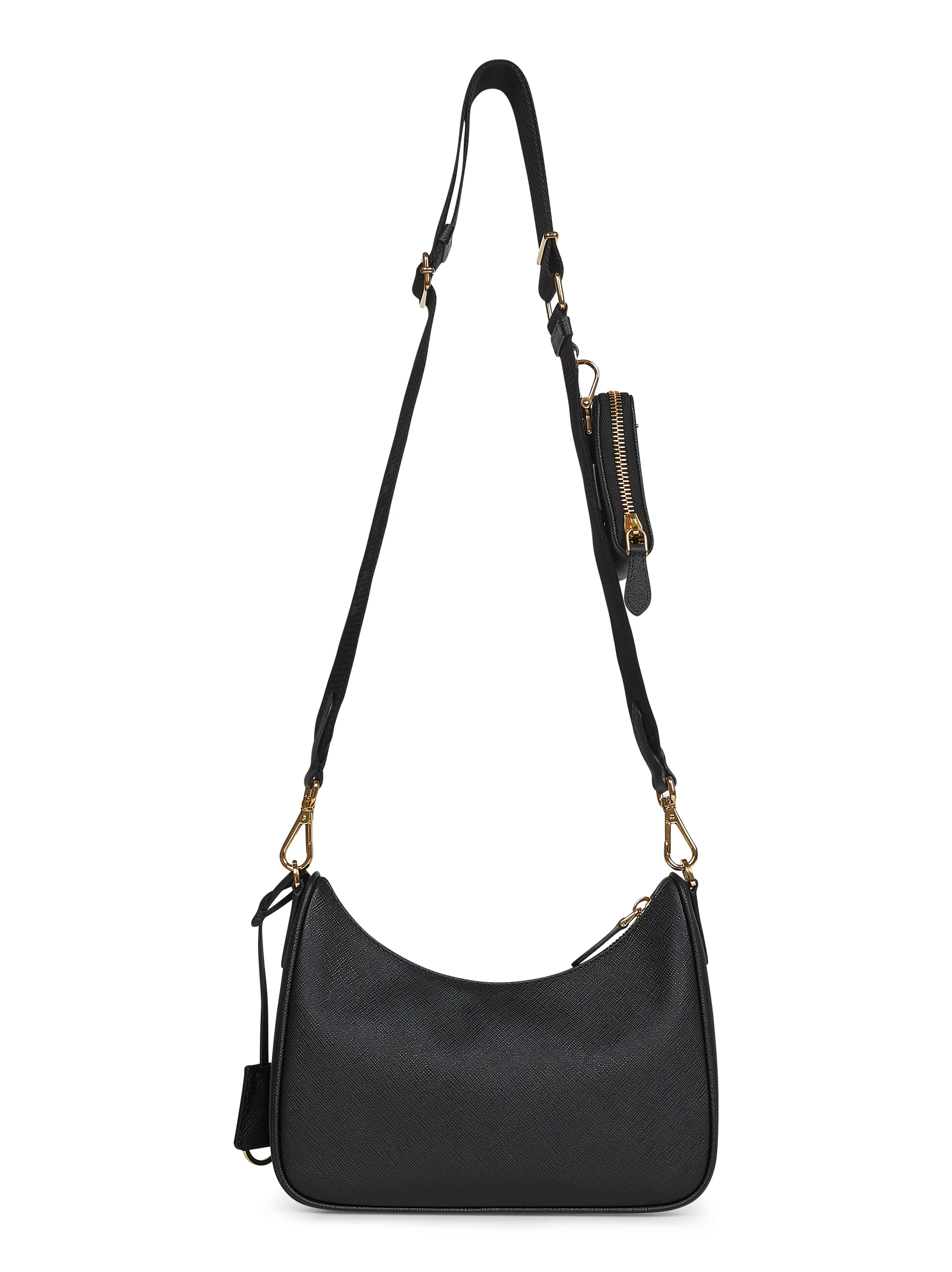 •Top zip fastening •Detachable metal chain handle; adjustable and detachable logo-print woven tape shoulder strap with detachable leather zipped pouch with enameled metal triangle logo •Enamelled metal triangle logo at front; leather Re-Edition key ring •Interior: one main compartment; logo-print nylon lining •Gold-toned metal hardware •Saffiano leather design •22 X 18 X 6 cm; max shoulder strap drop: 60 cm •Black color •100% Calf Leather •Made in Italy
