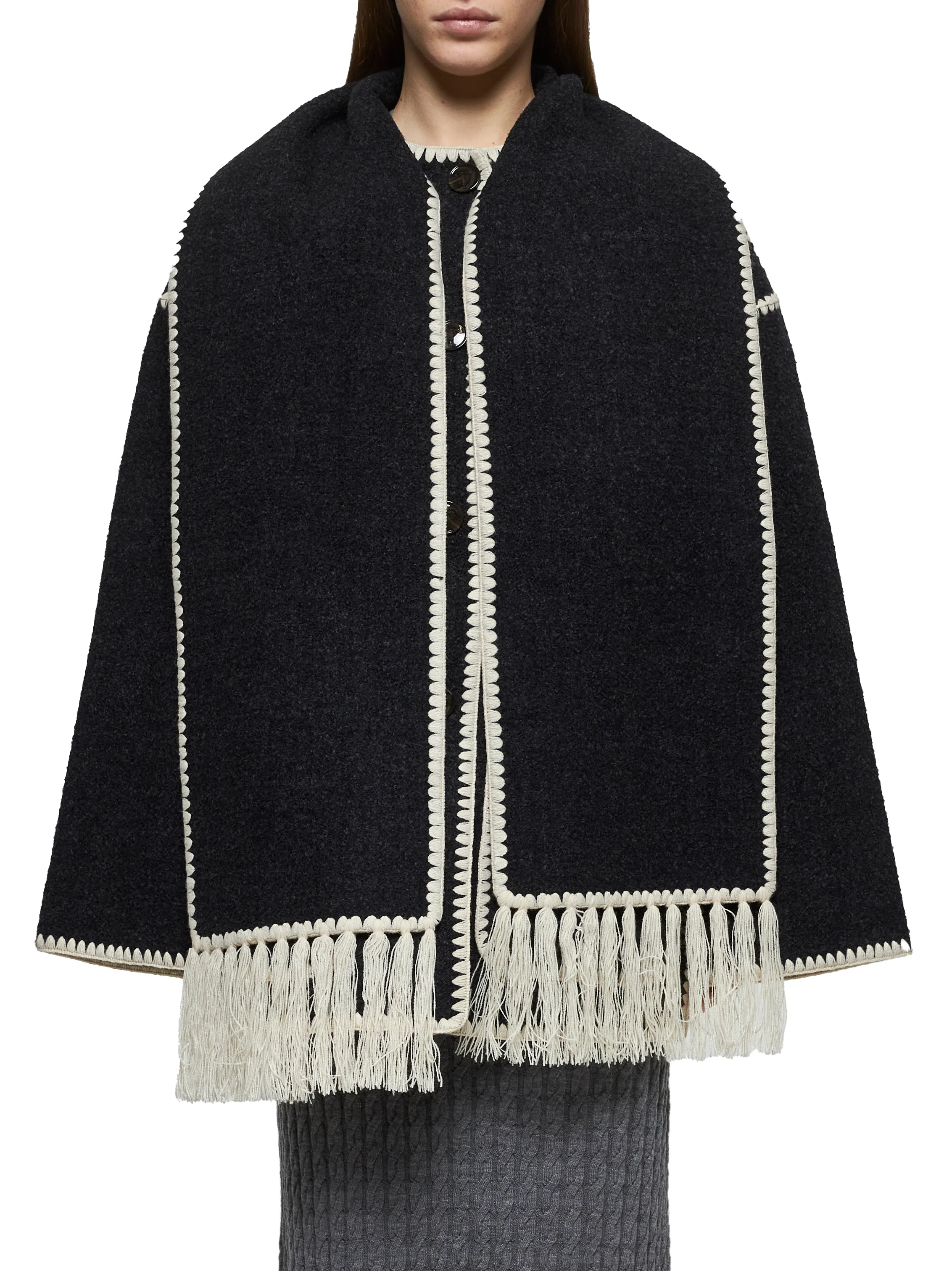 •Front button placket •Crewneck; matching built-in scarf with fringes at both edges •Long sleeves, dropped shoulders •Front patch pockets •Contrasting embroidery detailing along edges •Oversized fit •Grey color •68% Merino Wool, 20% Recycled Wool, 12% Recycled Polyester •Made in Extra EU