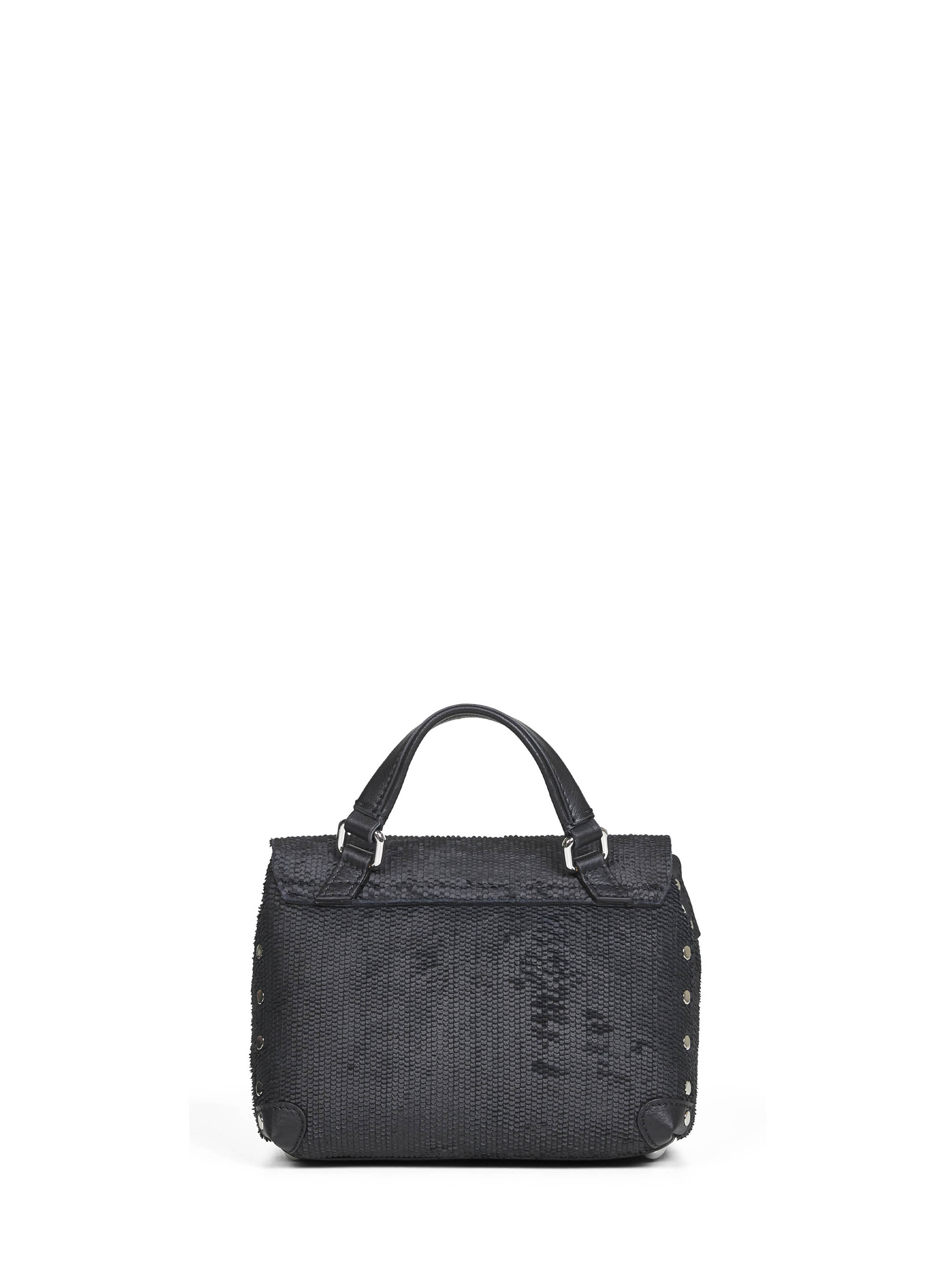 •Foldover-top with double metal twist lock fastening •Top leather handle; adjustable and detachable leather shoulder strap •Interior: one main compartment, one flat pocket •Metal studs detail at sides •Metal feet •Smooth tone-on-tone leather finished •Silver-toned metal hardware •Scale leather design •19 X 14 X 10 cm; handle drop: 7 cm •Black color •100% Bovine Leather •Made in Italy